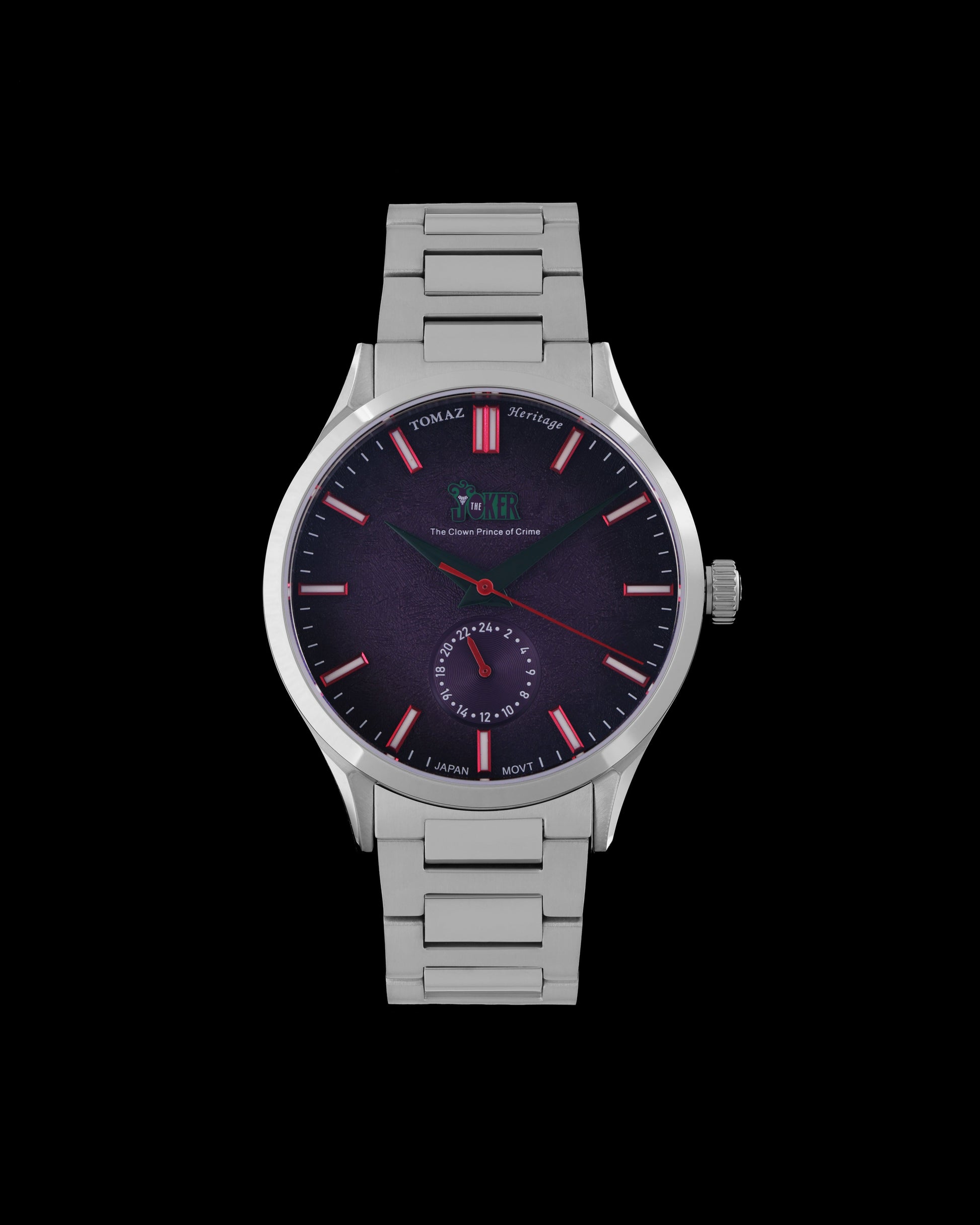 Unleash bold style with the Tomaz Heritage TQ056-DD1, inspired by the Clown Prince of Crime. This timepiece features a striking embossed dial with signature Joker artwork, luminous red-accented index markers, and vibrant green and red brass hands. Powered by the reliable Miyota Quartz 6P28 movement, it offers precise timekeeping with a 24-hour subdial.